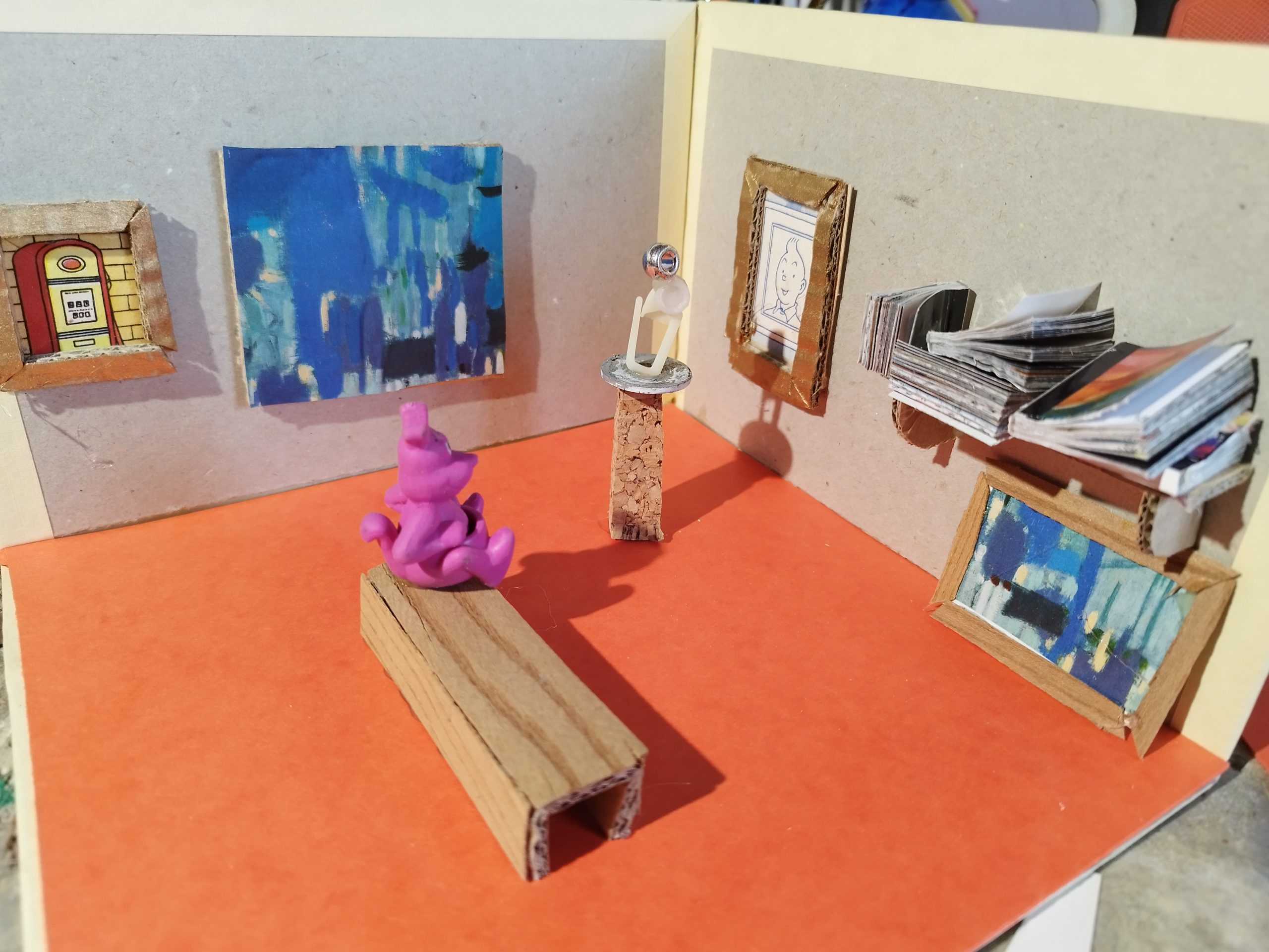 Avec quelques éléments de récupérations, on peut réaliser une maquette en diorama (relief et 3D) miniature et explorer notre Imaginaire en réalisant des mini-tableaux, des mini-livres pour une bibliothèque de livres d’Art et pourquoi pas des sculptures miniatures incroyables, mais tellement VRAIES !